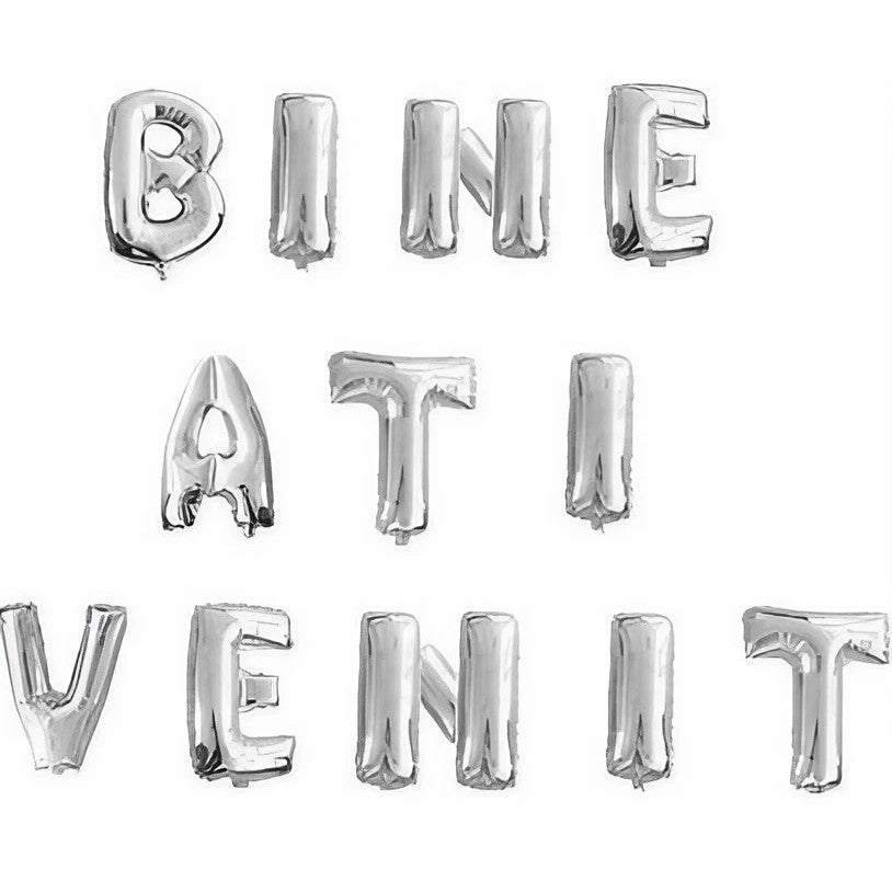 Set Baloane din Folie Metalizata, Flippy, Figurine Litere, Model Bine Ati Venit, Tema Aniversare, 40 cm, Ambalaj Individual, Pai inclus, Umflare cu Aer sau Heliu, Argintiu...