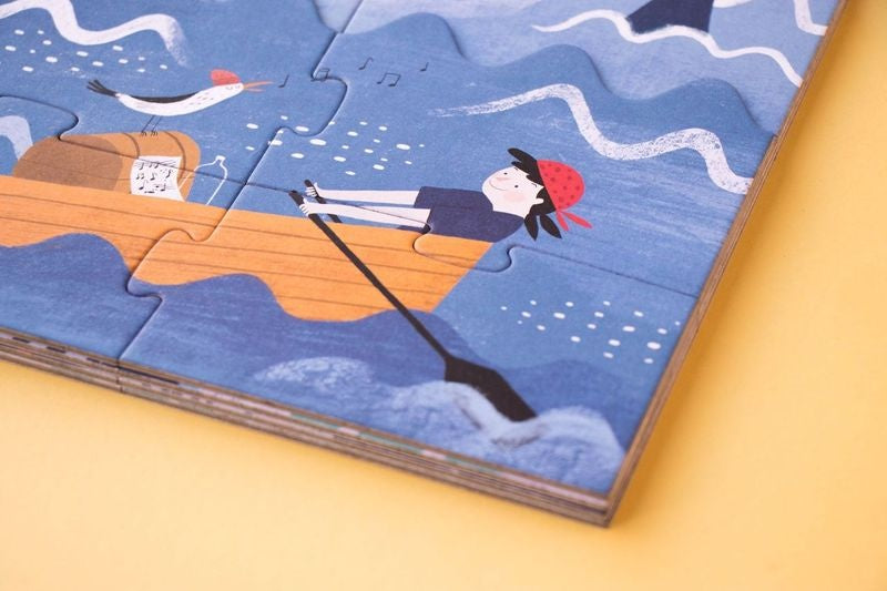 Puzzle Comoara ascunsa – descopera misterul! Ce mesaj în sticlă ne-a lăsat sirena? Copilul va afla povestea piraților și va descoperi comoara ascunsă pe fundul mării completând acest puzzle fascinant! Setul conține 4 puzzle-uri cu tematică pirați și comori , având 4, 8, 12 și 16 piese , care se asamblează în straturi, de la cel mai mare la cel mai mic, oferind o experiență captivantă și interactivă pentru cei mici. Explorați lumea piraților și descoperiți comoara ascunsă! 🏴☠️ 🔹 Ilustrație: Queralt Armengol 🔹 Dimensiune puzzle: 52 x 23,6 cm 🔹 Materiale: Hârtie FSC și carton reciclat 🔹 Vârstă recomandată: 3-6 ani 🔹 Fabricat în Barcelona Avertisment! Nu este potrivit pentru copiii sub 3 ani. Conține piese mici. Produs de Londji.