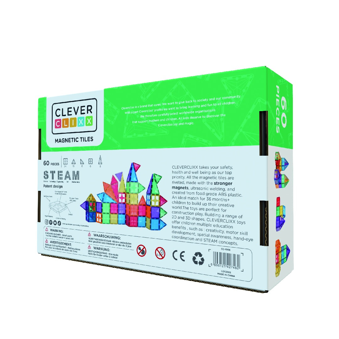 Set de Constructie Cleverclixx - 60 Piese: Creativitate Fara Limite! Descoperă plăcerea nesfârșită a construcțiilor cu acest set original Cleverclixx de 60 de piese! Copilul va explora diferite forme și culori, dezvoltându-și imaginația și abilitățile motorii. Este un set introductiv care poate fi ulterior extins cu seturile suplimentare Cleverclixx! 🚀 Creativitate fără limite și învățare prin joacă Încurajează explorarea de forme noi și structuri inovatoare . Dezvoltă gândirea spațială și abilitățile de rezolvare a problemelor . Perfect pentru joacă individuală sau în grup. 🌟 Experiență de construcție fără limite Creează structuri diverse . Conține piese patrate, dreptunghiulare, triunghiulare, crenelate, de dimensiuni si culori diferite. Compatibil cu alte seturi Cleverclixx precum și cu alte seturi magnetice pentru construcții infinite. Se poate fixa pe suprafețe magnetice, precum un calorifer, pentru a crea în plan vertical . Se poate desena și scrie pe piese cu markere lavabile pentru mai multă distracție. 🎓 Învață prin metoda STEAM Joaca cu Cleverclixx stimulează dezvoltarea motorie și cognitivă , fiind tot mai des utilizată în grădinițe și școli primare. 🌍 STEAM = Știință, Tehnologie, Inginerie, Arte & Matematică – o metodă modernă de învățare practică. 🏆 Calitate și siguranță ✔ Potrivit pentru copii de la 3 ani ✔ 60 de piese din plastic MABS fără BPA ✔ Certificări: CPSC, CE, EN71, ASTM Transformă fiecare sesiune de joacă într-o aventură creativă și educativă! AVERTISMENT: Contraindicat copiilor sub 3 ani. Se recomandă supravegherea copilului de către un adult în timpul jocului. Produs de Cleverclixx